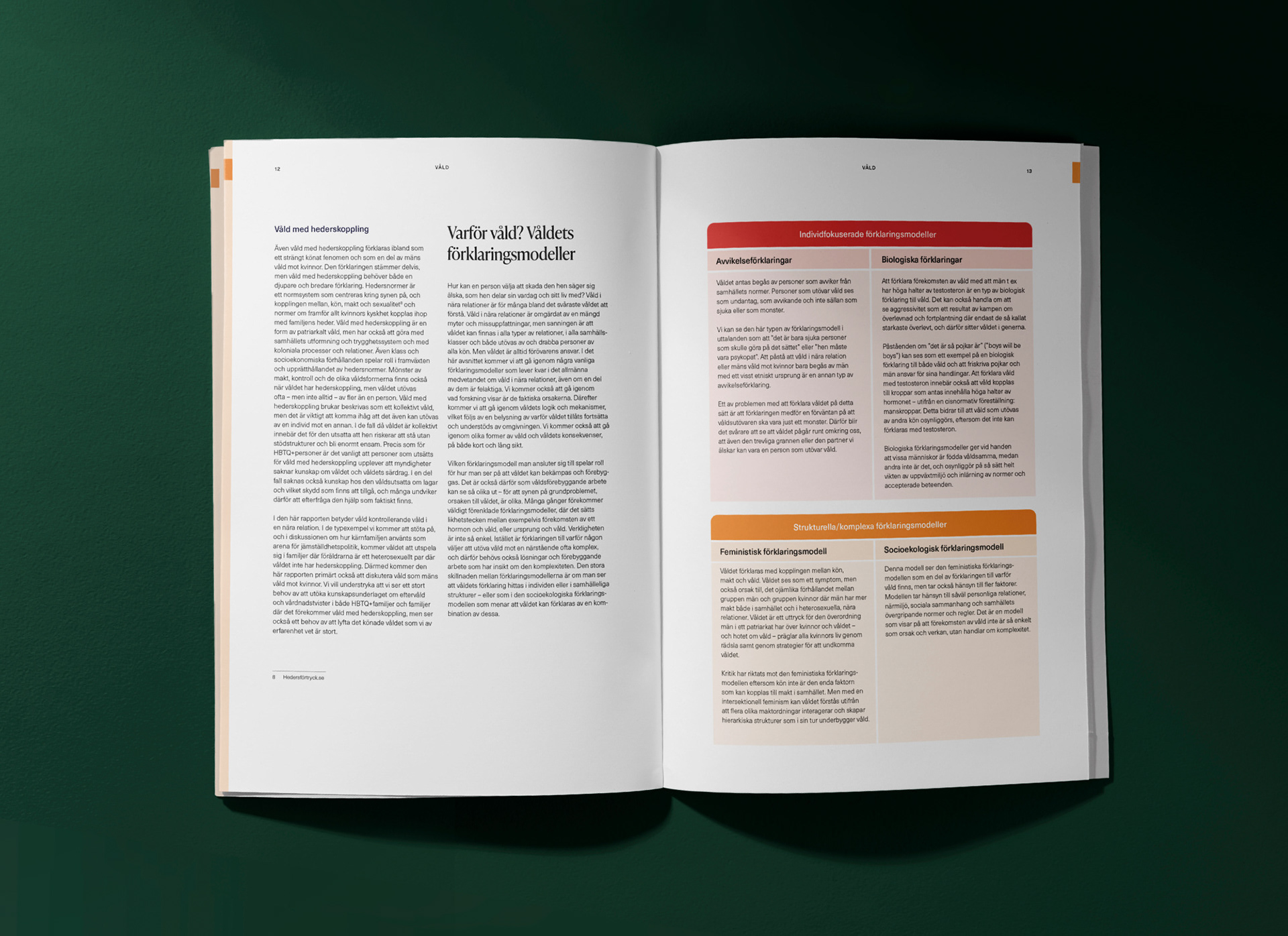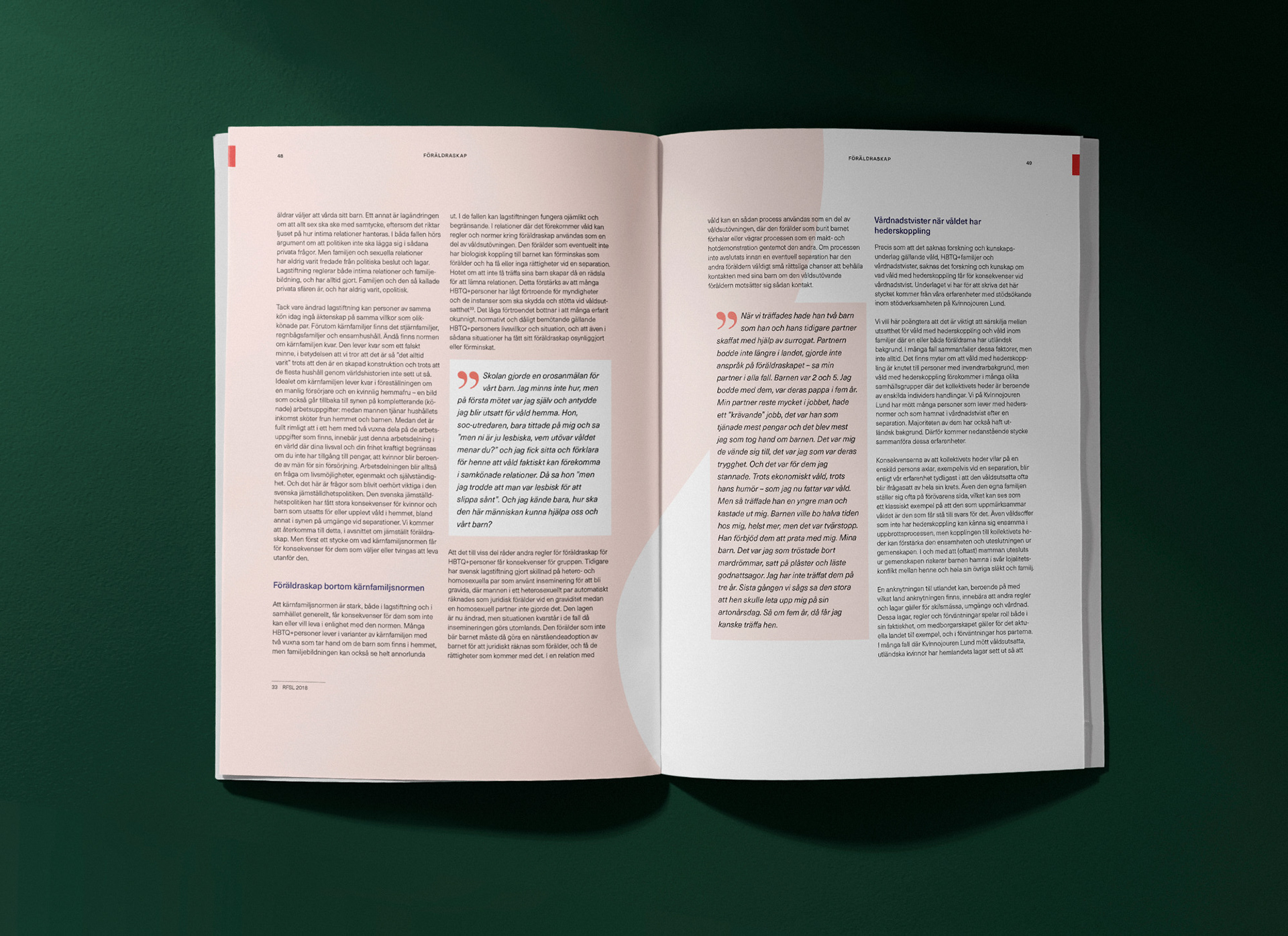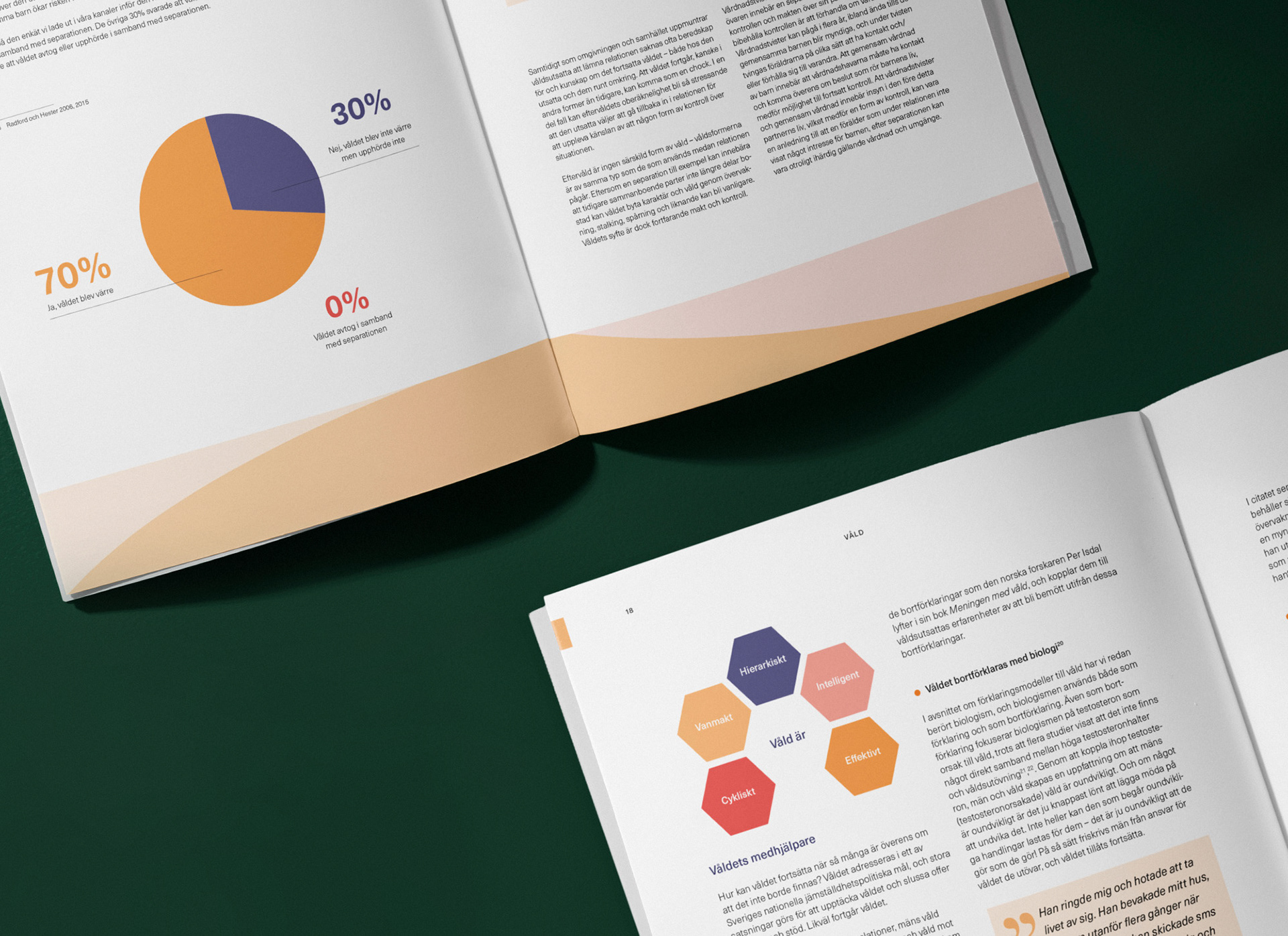 I designed a comprehensive report for non-profit organization Kvinnojouren Lund, a report that examines issues related to violence, parenthood and custody. The challenge was to present a large amount of information in a structured, readable and approachable way through clear typography, color and data visualization.